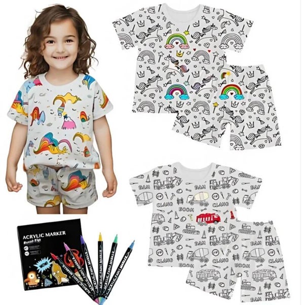 The perfect activity. Create your very own custom loungewear with these great soft cotton sets designed to be coloured in. Available in 6 different designs for both boys and girls. Use the free fabric pens to colour in the design!